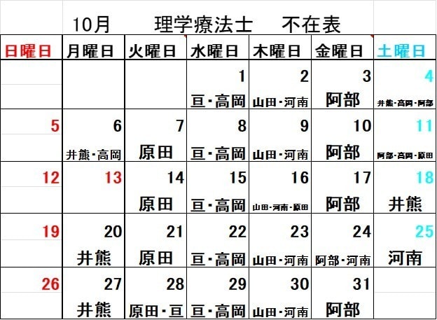 理学療法士 不在表